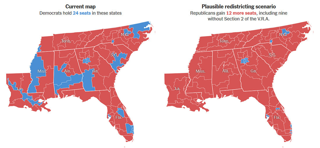 The Voting Rights Act of 1965 is key here— it’s been weaponized to favor Democrats in southern states, but if the Supreme Court strike down Section 2, Dems could lose up to 12 districts.
